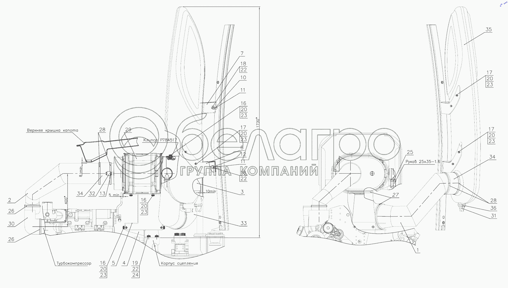 Каталог запасных частей к технике: МТЗ БЕЛАРУС 3525. Установка воздухоочистителя 3022С-1109125