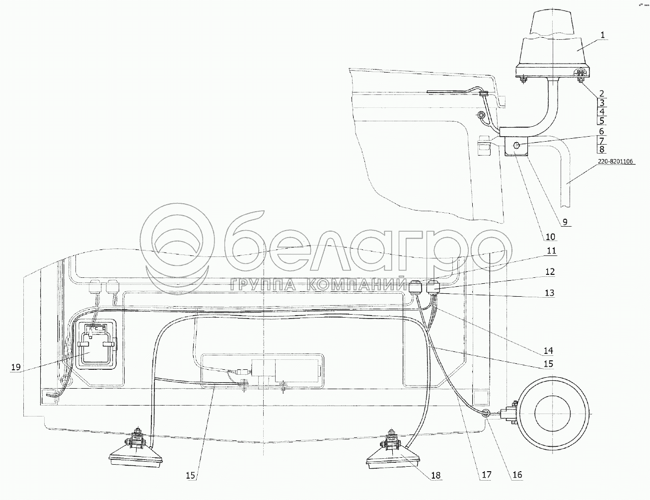 Каталог запасных частей к технике: МТЗ Беларус-422.1. Электрооборудование крыши. Установка маяка сигнального