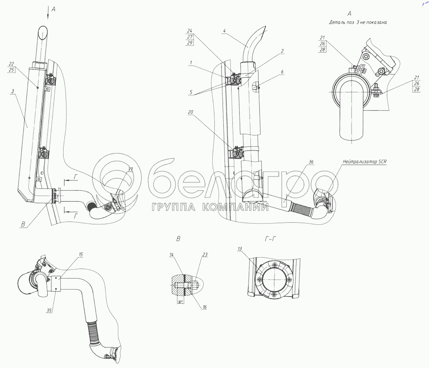 Каталог запасных частей к технике: МТЗ БЕЛАРУС 952.7. Глушитель. Установка глушителя 923.7С-1205005
