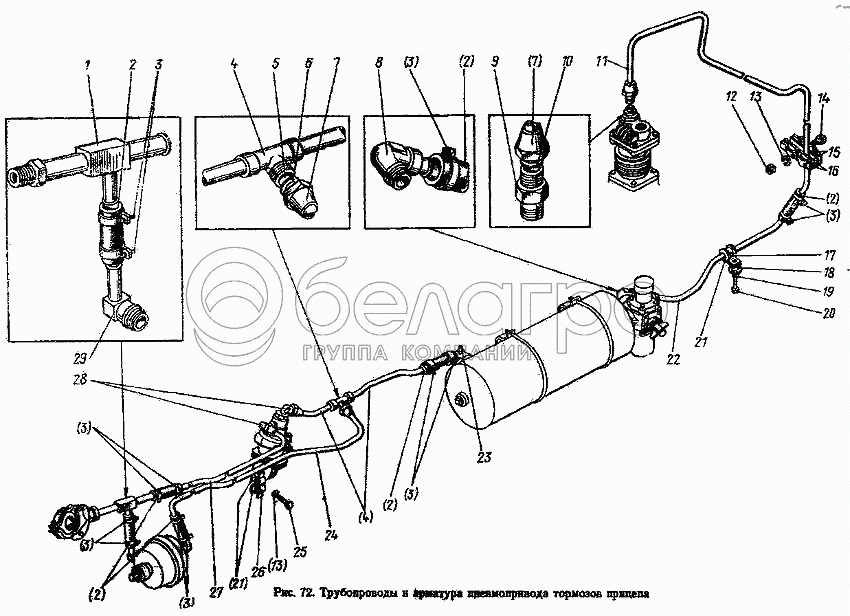 Каталог запасных частей к технике: МТЗ-100. Трубопроводы и арматура пневмопривода тормозов прицепа