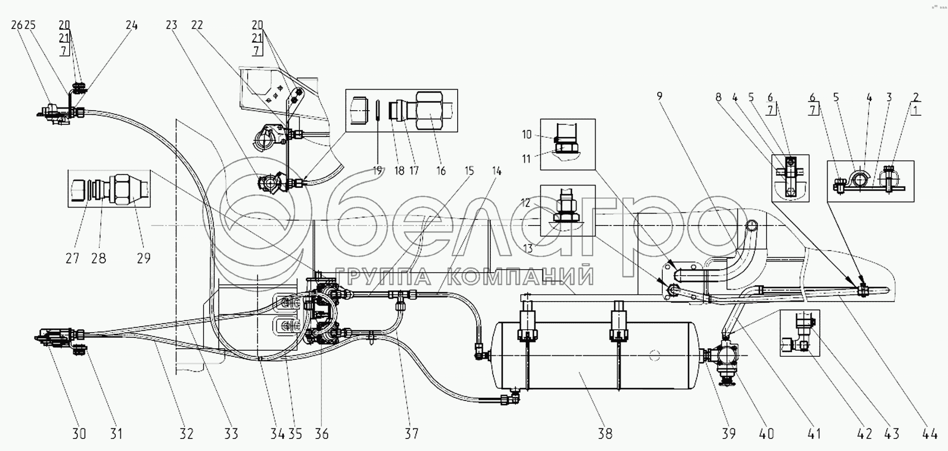 Каталог запасных частей к технике: МТЗ-1221.4. Трубопроводы и арматура пневмопривода тормозов прицепа