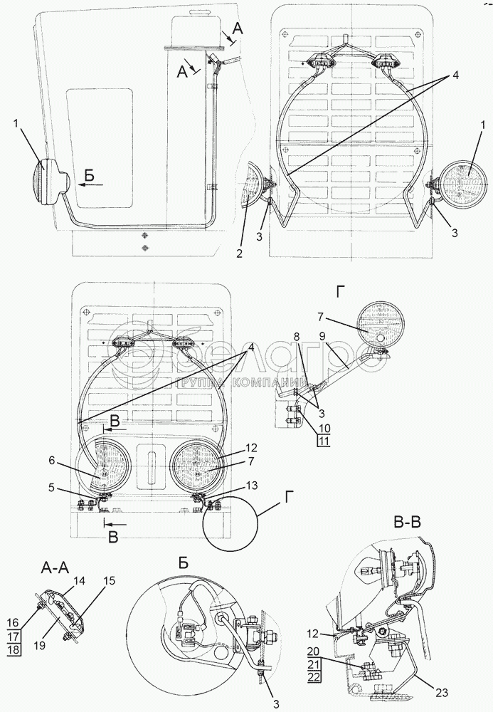 Каталог запасных частей к технике: МТЗ-1221.4. Установка фар дорожных. Встроенные фары.