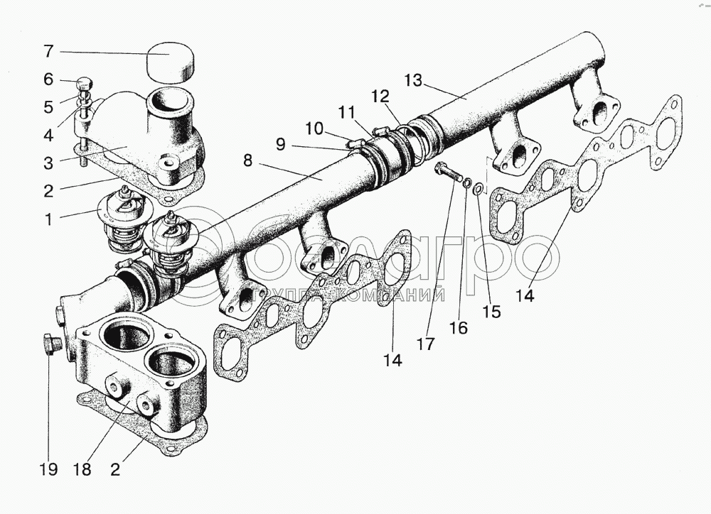 Каталог запасных частей к технике: МТЗ-1523 (2008). Труба водосборная и термостаты
