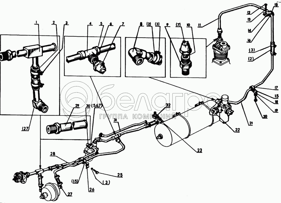 Каталог запасных частей к технике: МТЗ-80. Трубопроводы и арматура пневмопривода тормозов