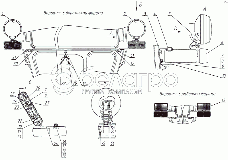 Каталог запасных частей к технике: МТЗ-900/920/950/952. Установка фонарей передних