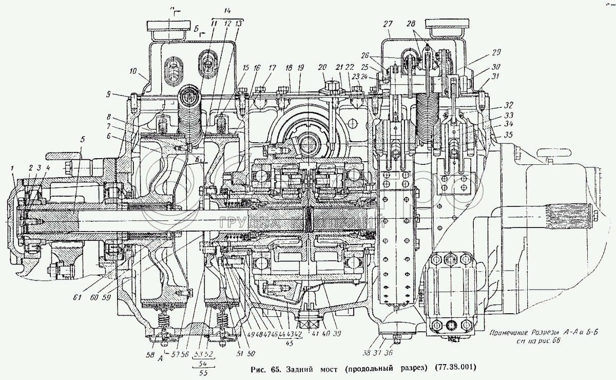 Каталог запасных частей к технике: ВгТЗ ДТ-75М. Задний мост (продольный разрез) (77.38.001)