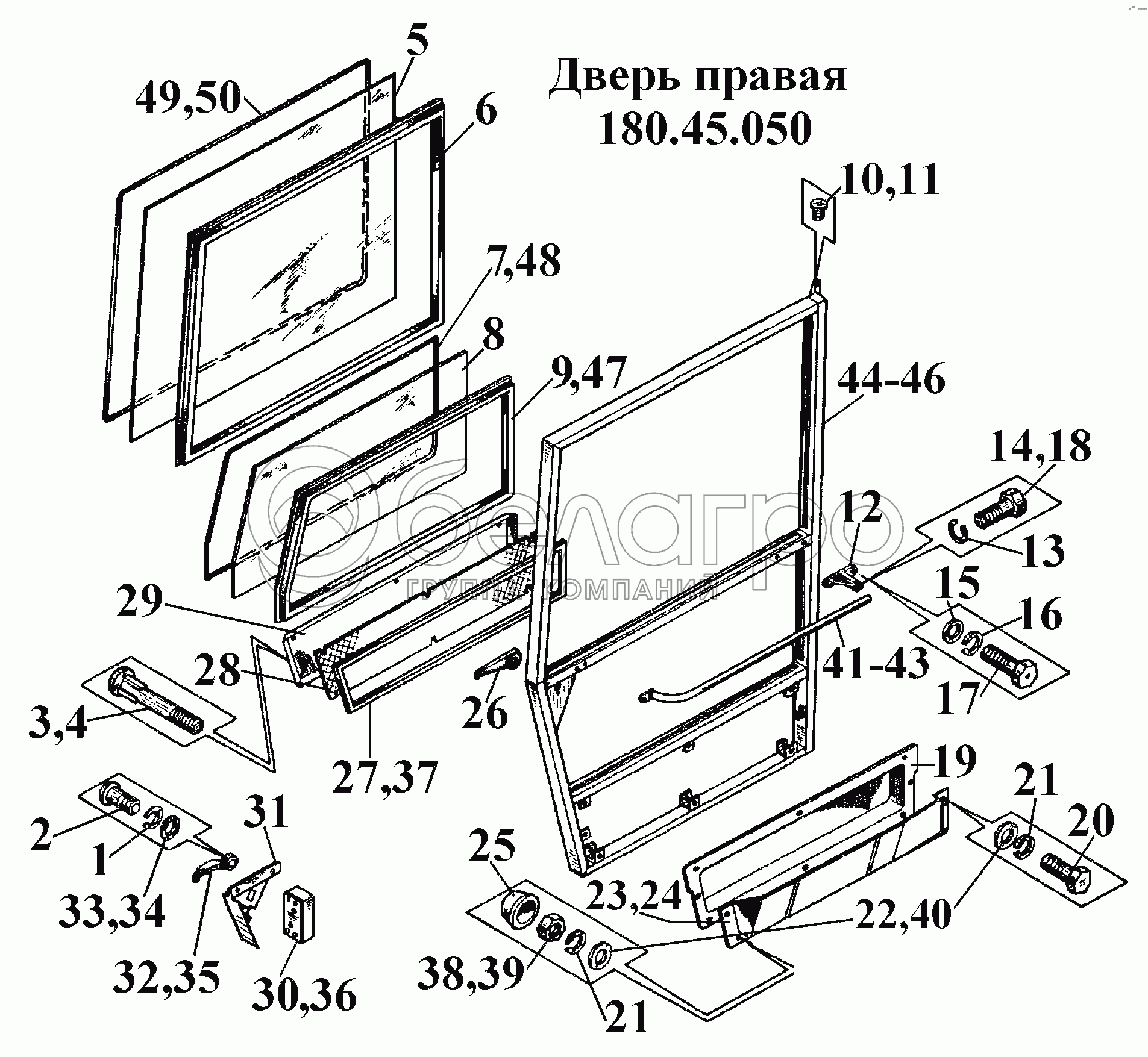 Каталог запасных частей к технике: ВгТЗ ВТ-100Д. Дверь правая 180.45.050