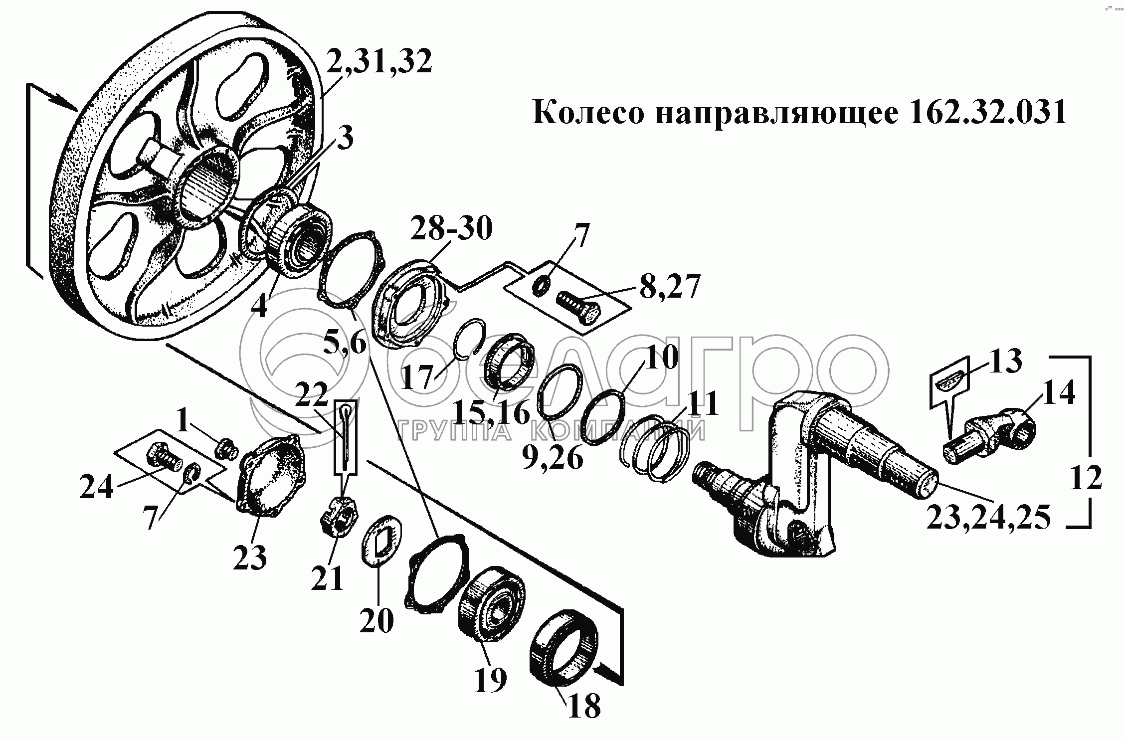 Каталог запасных частей к технике: ВгТЗ ВТ-100Д. Колесо направляющее 162.32.031 (1)