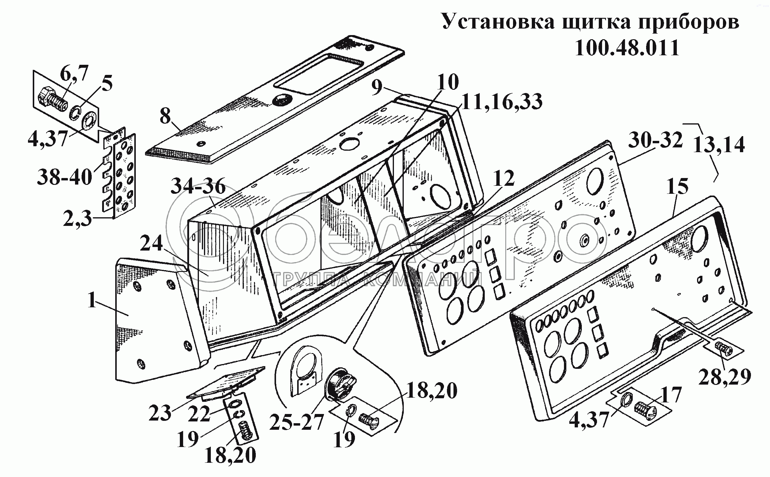 Каталог запасных частей к технике: ВгТЗ ВТ-100Д. Установка щитка приборов 100.48.011