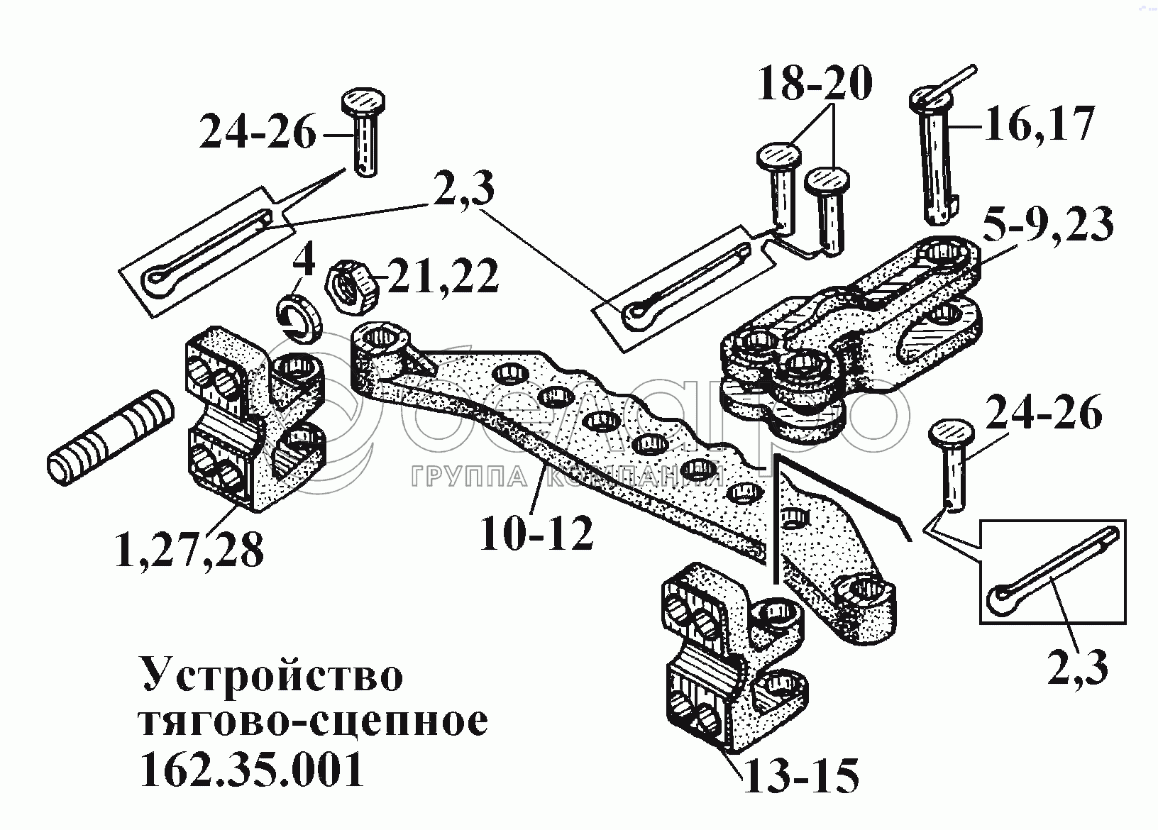 Каталог запасных частей к технике: ВгТЗ ВТ-100Д. Устройство тягово-сцепное 162.35.001