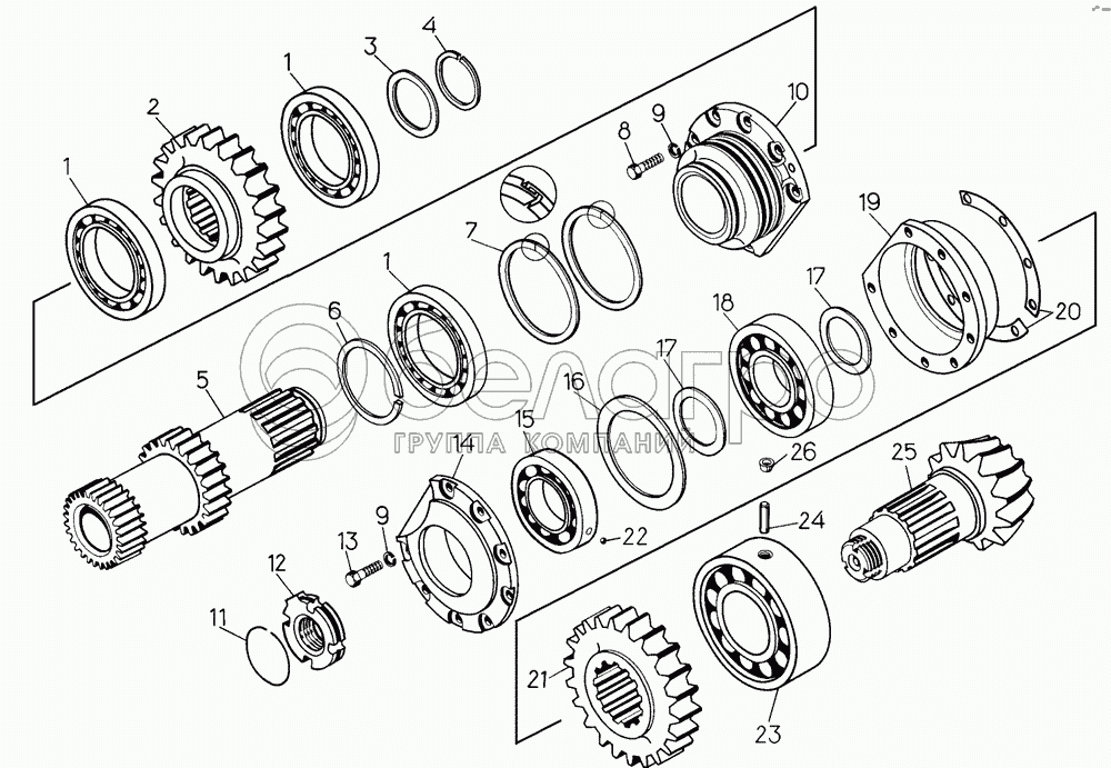 Каталог запасных частей к технике: ЧТЗ Бульдозер Б11. Вал-шестерня с деталями