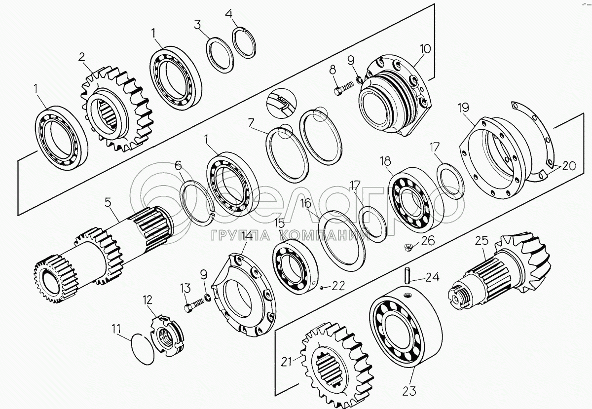 Каталог запасных частей к технике: ЧТЗ Бульдозер Б14. Вал-шестерня с деталями