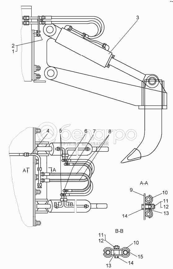Каталог запасных частей к технике: ЧТЗ Рабочее оборудование Б10М. Установка гидроцилиндров и трубопроводов