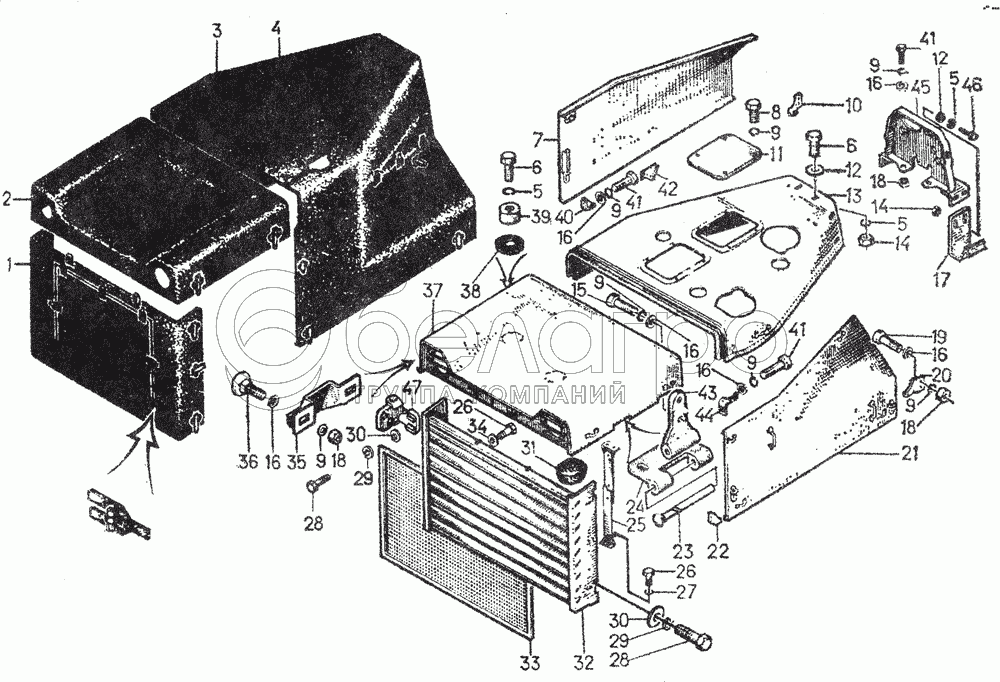 Каталог запасных частей к технике: ЧТЗ Т-130. Капот для гидрофицированных тракторов 18-55-сб11