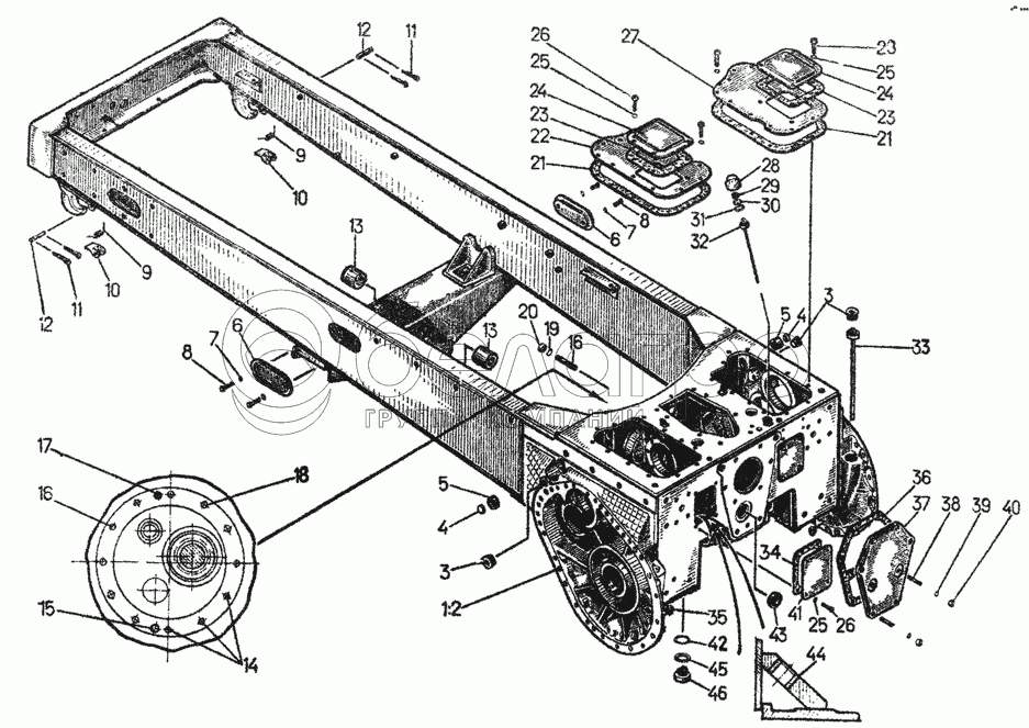 Каталог запасных частей к технике: ЧТЗ Т-130. Корпус бортовых фрикционов с деталями трансмиссии