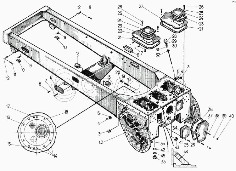Каталог запасных частей к технике: ЧТЗ Т-170М-01. Корпус бортовых фрикционов с лонжеронами