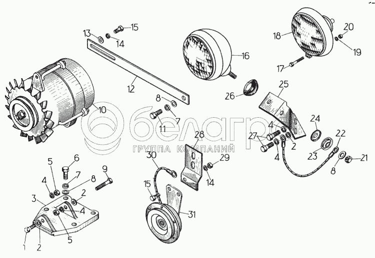 Каталог запасных частей к технике: ЧТЗ Т-170М-01. Установка генератора, сигнала и фар