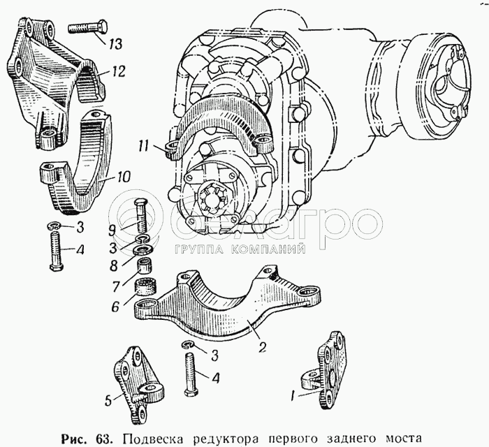 Каталог запасных частей к технике: МАЗ-537. Подвеска редуктора первого заднего моста