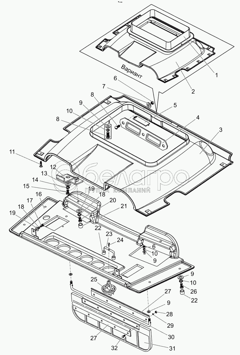 Каталог запасных частей к технике: МТЗ БЕЛАРУС 1502. Установка верхнего пояса. Панель. Козырек