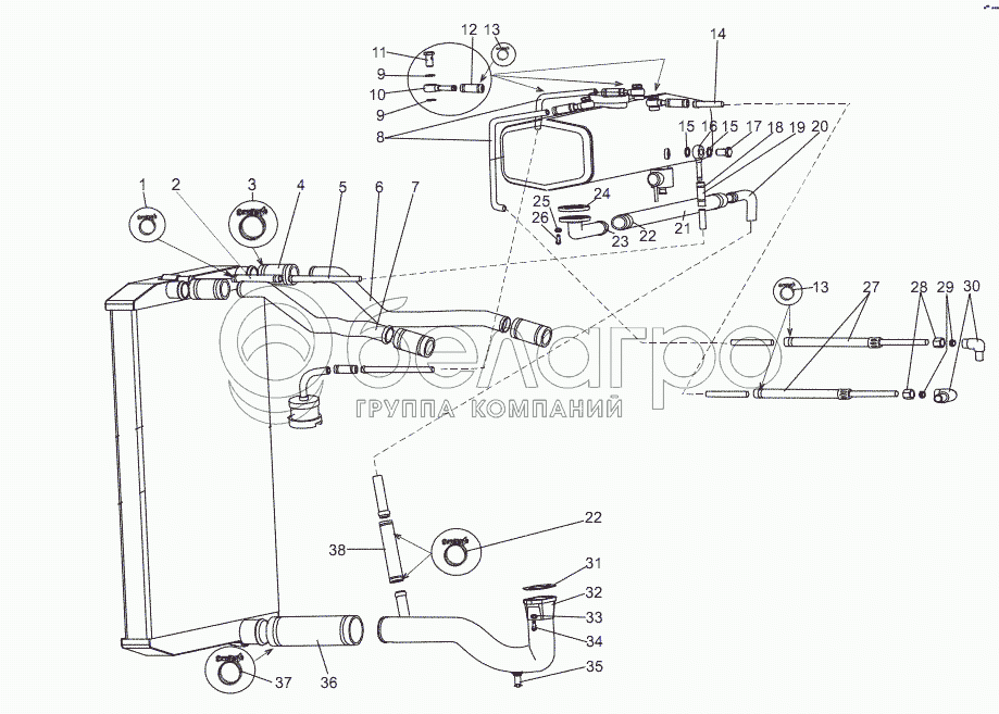 Каталог запасных частей к технике: МЗКТ-69234. Установка трубопроводов системы охлаждения двигателя