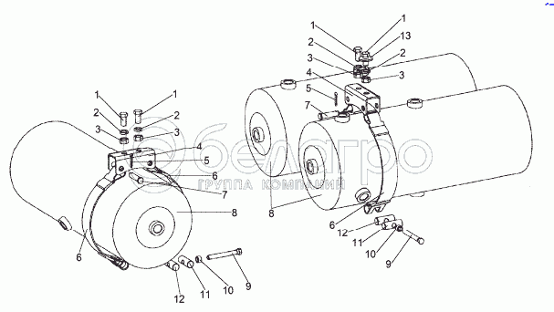 Каталог запасных частей к технике: МЗКТ-8006. Установка воздушных баллонов стояночного тормоза и потребителей