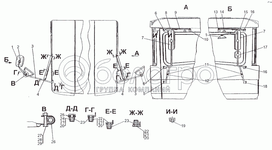 Каталог запасных частей к технике: МЗКТ-80211. Установка держателей зеркал и зеркал