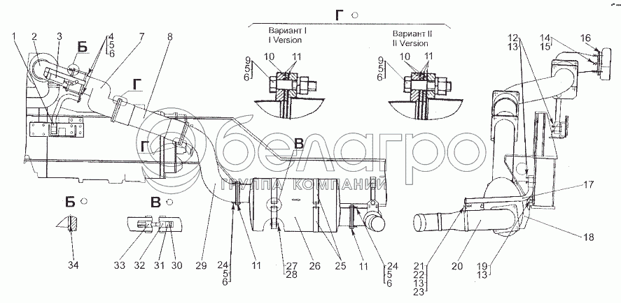 Каталог запасных частей к технике: МЗКТ-80211. Установка системы выпуска отработавших газов