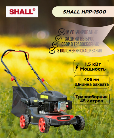 Несамоходная бензиновая газонокосилка SHALL HPP-1500 предназначена для косьбы травы на небольших садовых и приусадебных участках площадью до 1000 м2.